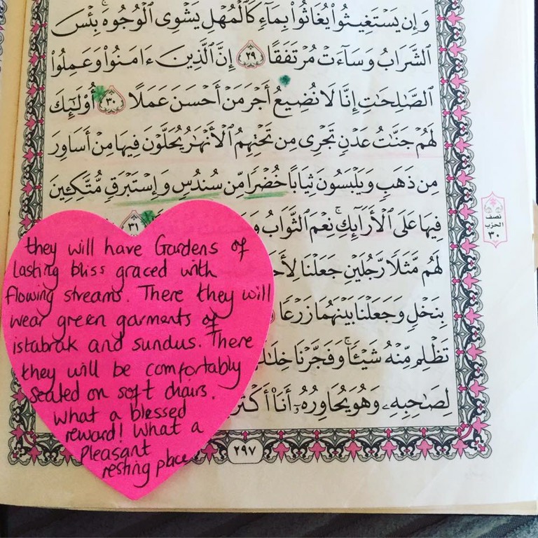 A permanent part of my daughter’s dua every Friday in the last hour before Maghrib, is asking Allah to give her purple, pink and green jewels and diamonds in Jannah. Her words are fixed and she is able to repeat the dua over and over again. At first it was kinda really cute, but then I realised that for her, it’s actually a very real and serious dua. She really wants those jewels. In Ramadan, I was telling her fufu (paternal aunt) this, her aunt quickly responded saying, oh there’s an ayah in Surah al Kahf where Allah talks about this and even mentions green garments. She then sent me a message saying its ayah 31 and highlighted the words Istabrak and Sundus for me.